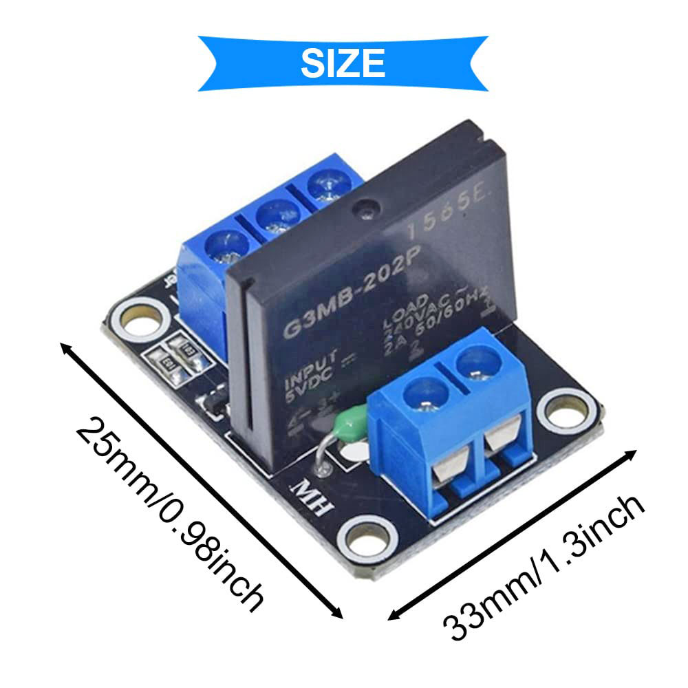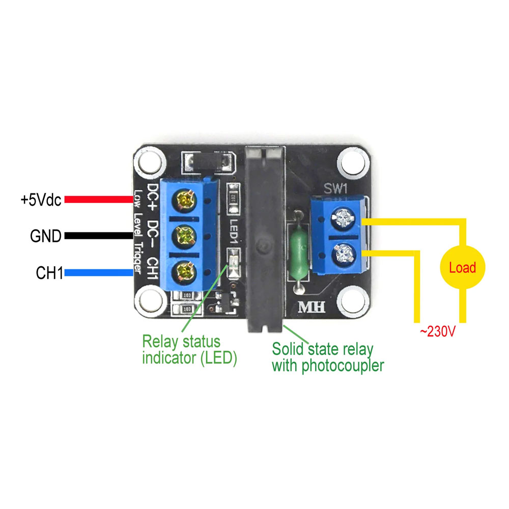 ولتاژ ورودی تغذیه آن 5 ولت DC با جریان مصرفی حدود 160 میلی آمپر بوده و توانایی سوئیچ کردن خروجی تا 240 ولت AC با جریان 2 آمپر را دارد . فیوز حفاظتی داخلی با مقاومت مناسب در برابر اضافه بار ، از ماژول و تجهیزات متصل شده محافظت می کند و موجب افزایش طول عمر آن می شود .