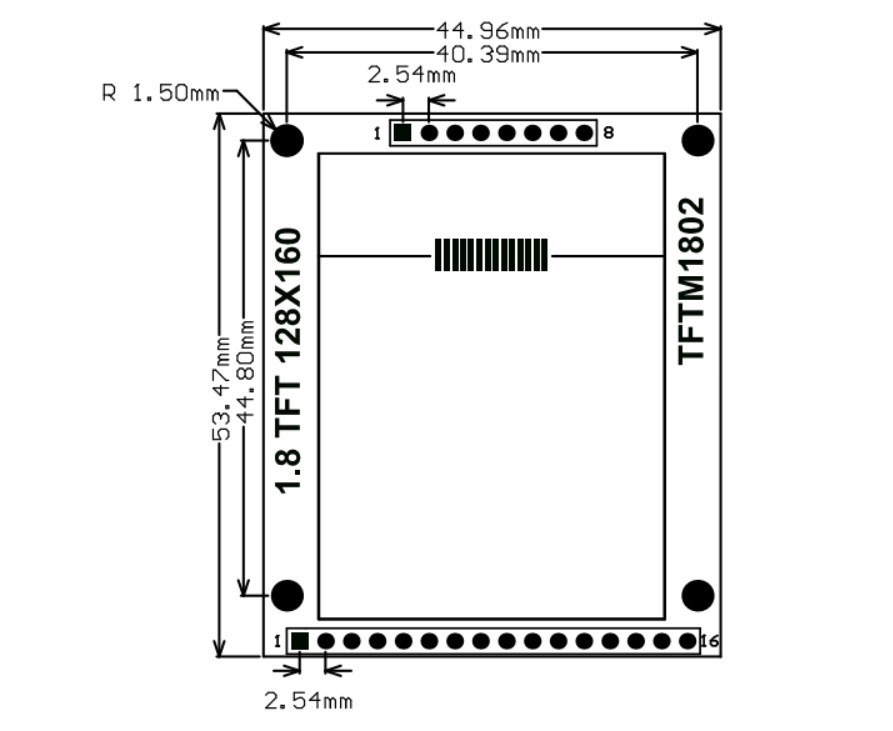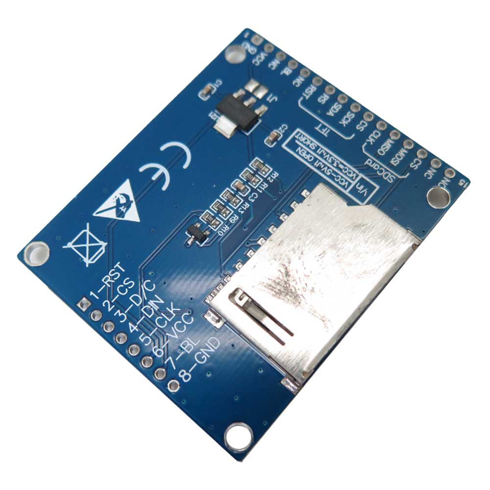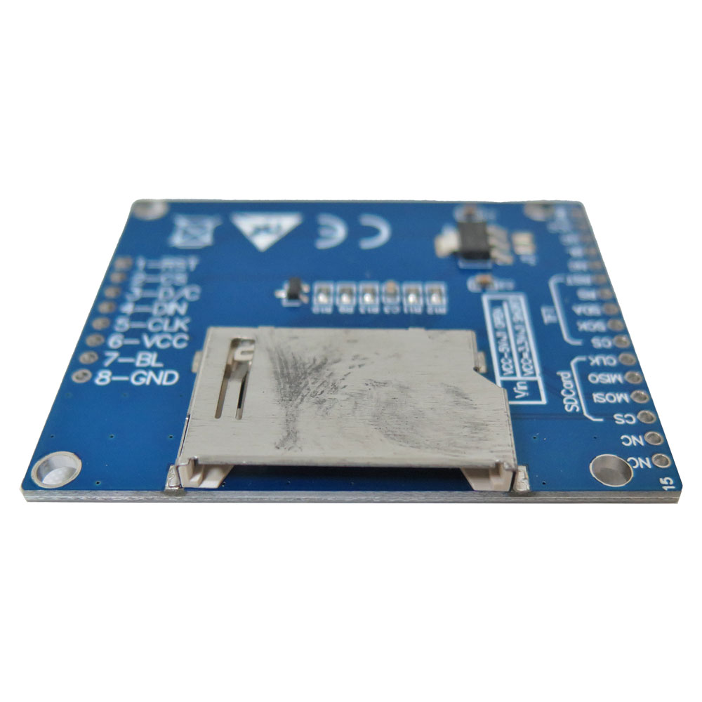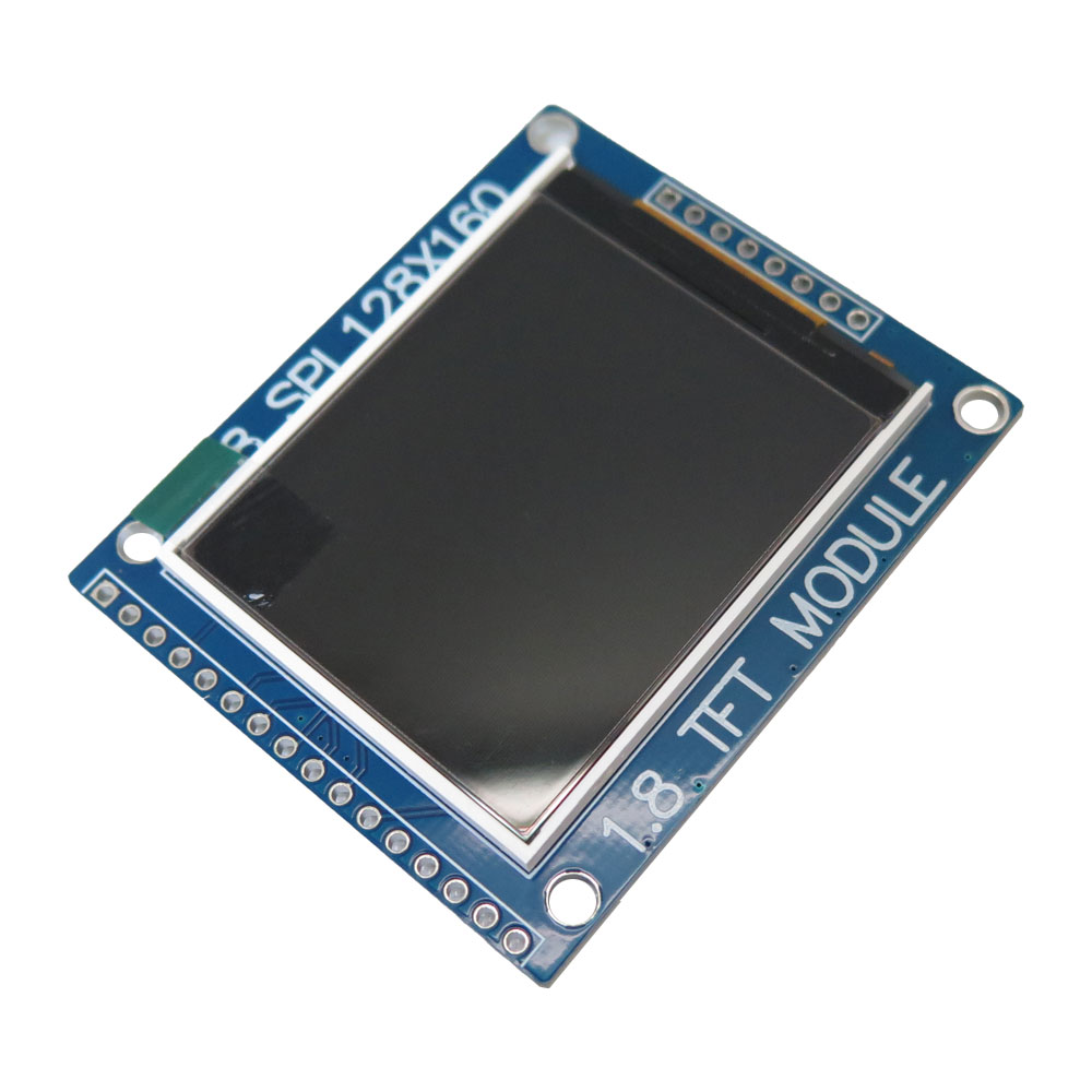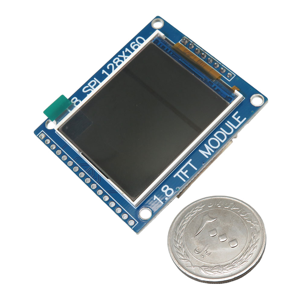 ماژول تمام رنگی 1.8 اینچی با درایور ST7735R رزولوشن160X128 پیکسل دارد و دارای رابط کاربری SPI چهار سیمه و بک لایت سفید است. نمایشگر توسط تراشه درایور ST7735S کنترل میشود و دارای سوکت کارت حافظه SD است.