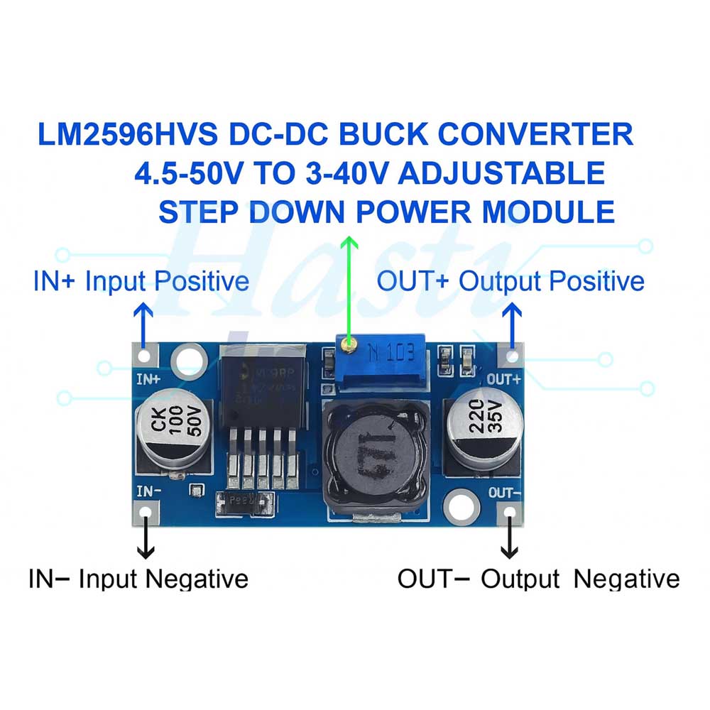 ماژول LM2596HVS یکی از کاربردی ترین مبدل های کاهنده ولتاژ در پروژه های الکترونیکی است و با ساختار سوئیچینگ Buck، امکان کاهش ولتاژ ورودی در محدوده 4.5 تا 53 ولت را فراهم می کند. این مدل با عنوان ماژول مبدل ولتاژ مدل LM2596HVS شناخته می شود و به دلیل بازده بالا و پایداری مناسب، در تغذیه انواع مدارها عملکرد قابل اعتمادی ارائه می دهد. ولتاژ خروجی این ماژول در بازه 3 تا 40 ولت قابل تنظیم است و کاربر می تواند به کمک مولتی ترن روی برد، خروجی مورد نیاز را با دقت بالا انتخاب کند.