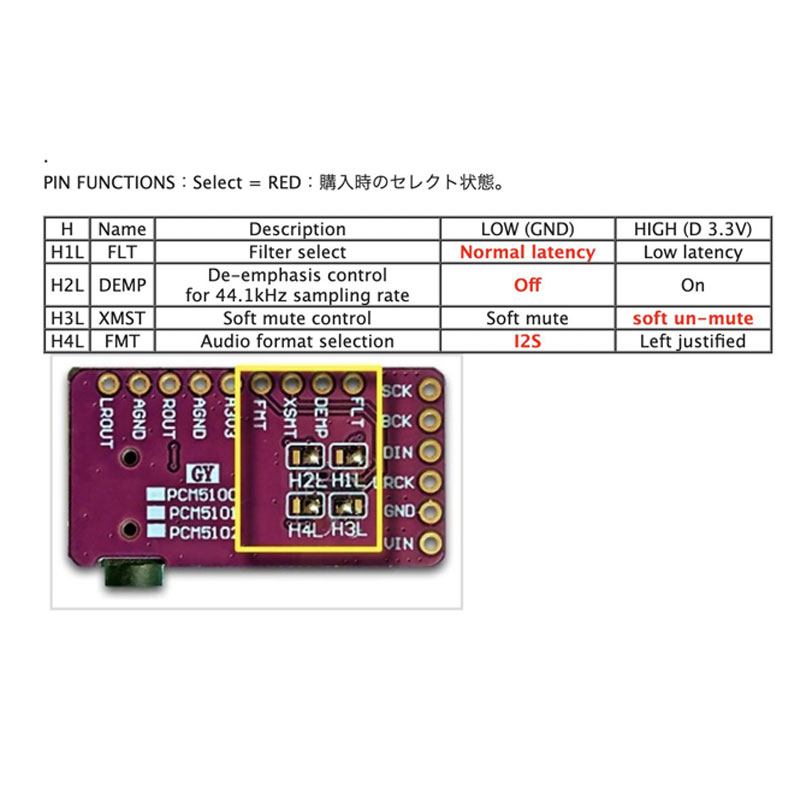 با این جامپر می توان حالت کاری تراشه PCM5102 را تعیین کرد. شامل انتخاب حالت I2S Mode یا Stand-alone Mode است. - پیکربندی فرمت صوتی (Audio Data Format)H3L