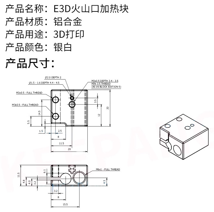 پرینتر های سه بعدی است که با هدف افزایش سرعت و کیفیت پرینت قطعات بزرگ طراحی شده است. این محفظه با استفاده از آلیاژ آلومینیوم ساخته شده و از مقاومت و دوام بالایی برخوردار است که امکان استفاده مداوم و طولانی مدت را بدون کاهش کارایی فراهم می کند. ابعاد این محفظه 20x20x11.5 میلی متر است و دارای محل لوله رزوه دار M6 می باشد که نصب و اتصال آن به اکسترودر های V6 Bowden و direct J-head را به سادگی امکان پذیر می کند.