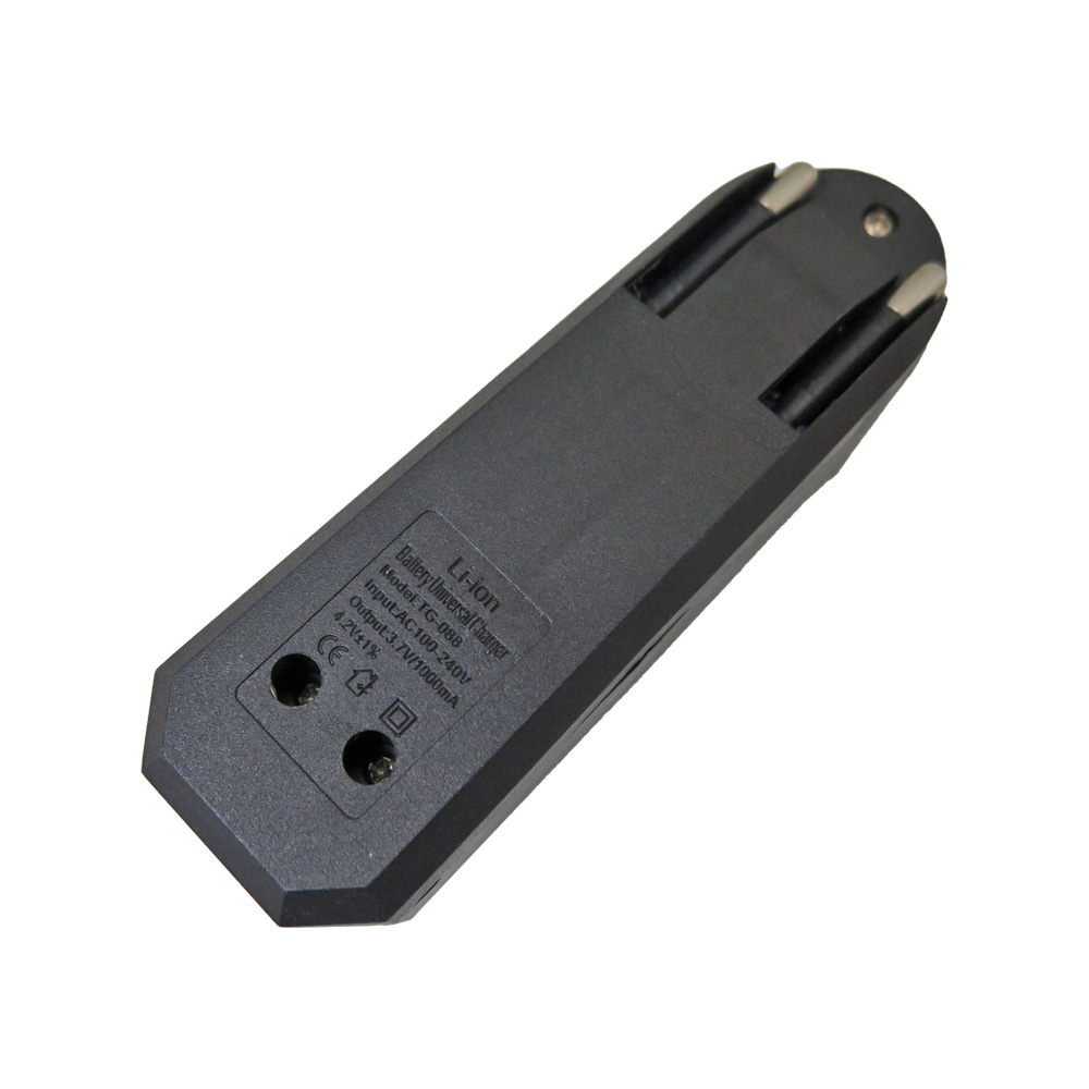 Patented design with built-in switching power supply and global voltage compatibility. Direct plug-in to mains with a rotary plug for easy use and portability. Supports nominal 3.6 to 3.7 volt lithium-ion batteries in various sizes including 18650, 14500, and 16340. Certified with CE, featuring a flash function, compatibility with older lithium batteries, and environmentally friendly support.