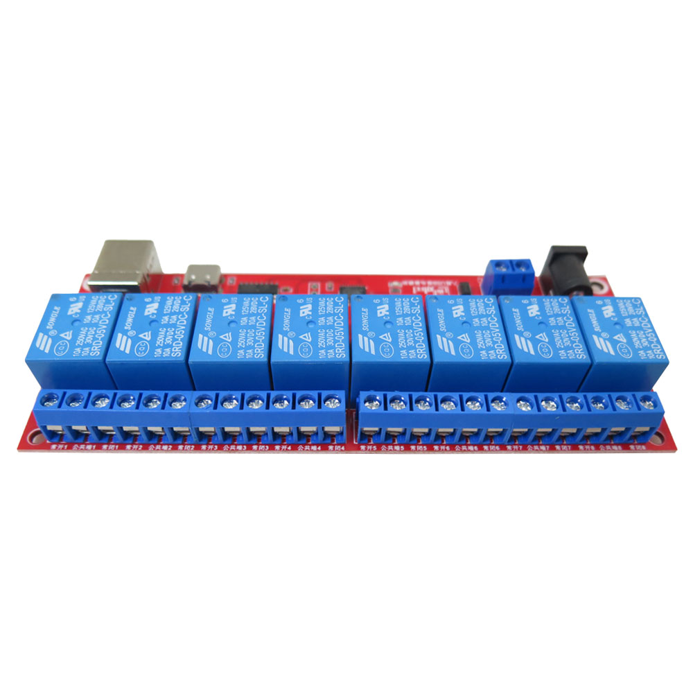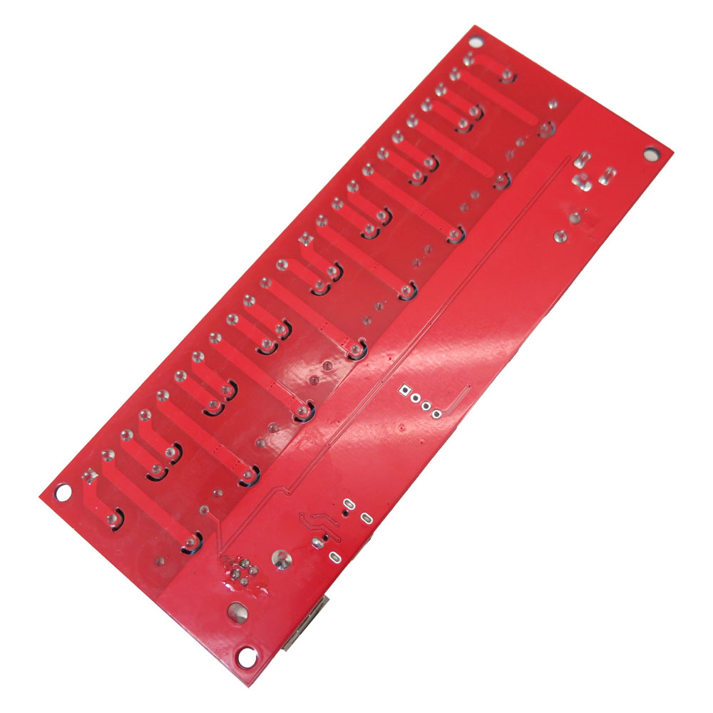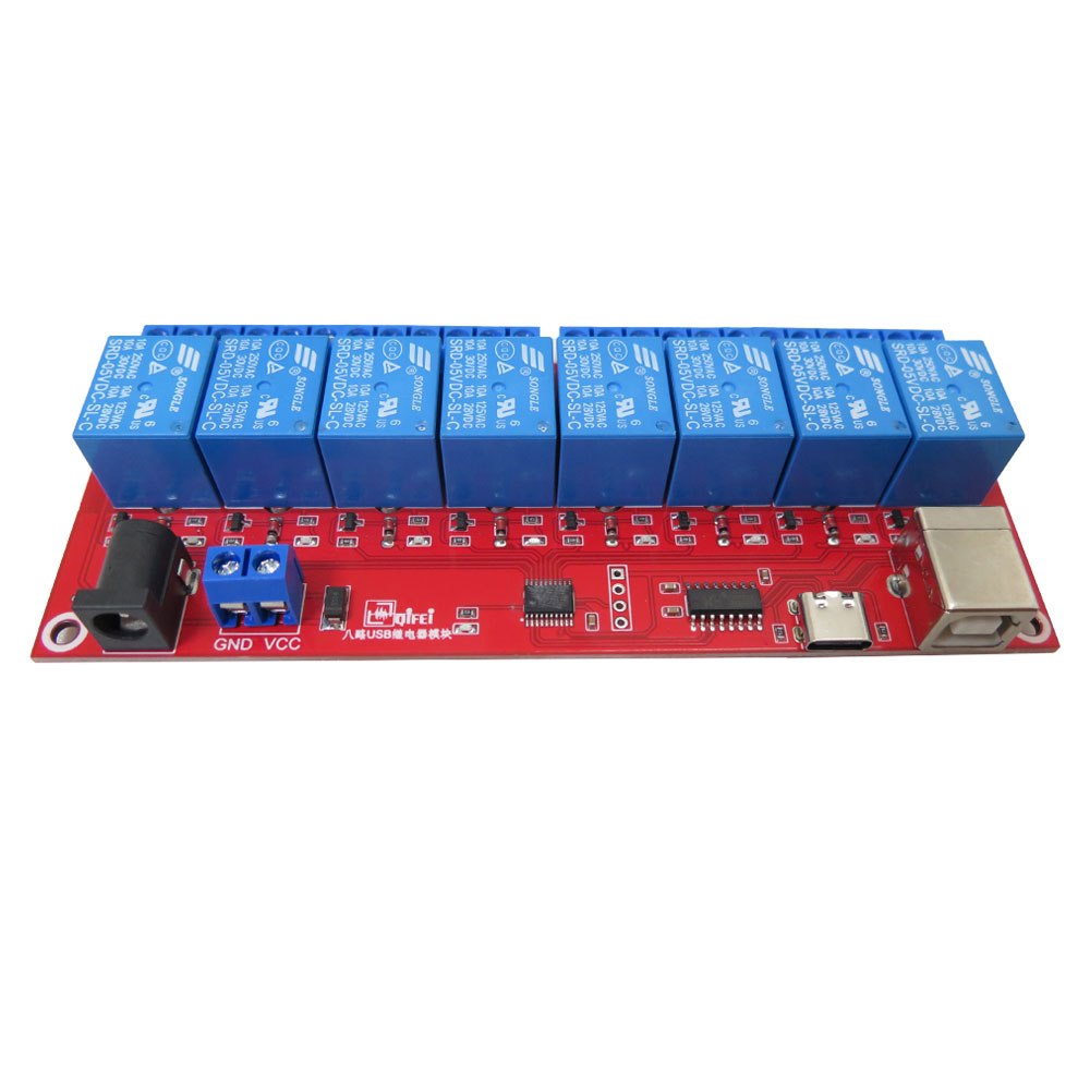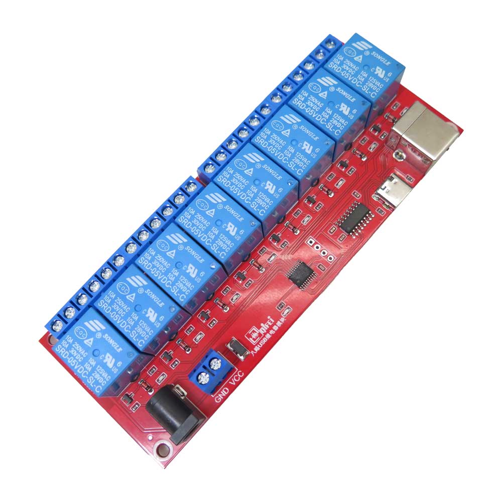 This product can be controlled by usb virtual serial port. The upper computer sends the command (the command can be set by the client software or use the default value) to control the switch of the 8-way relay