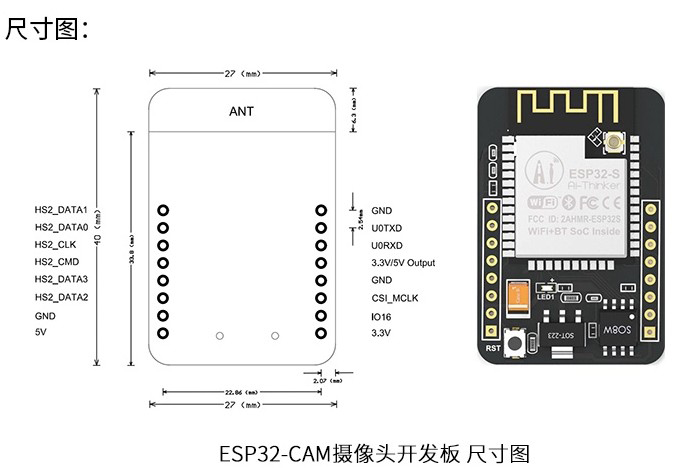 ESP32 CAM WiFi AND Bluetooth Camera Module is a compact wireless camera board which is based on OV2640 color CMOS UXGA (2.0 MegaPixel) CAMERACHIPTM with OmniPixel2TM Technology with a dual wireless module of WIFi and Bluetooth wireless, 4MBit SRAM, 32MB SPI flash memory, and a TFT card slot for external memory up to 4GB. This stand-alone board has an ultra-low size and with 6mA sleep current, suitable for portable and tinny applications. This board is equipped with an LED flashlight for low light environments, 16x through-holes with UART, SPI, I2C, PWM interfaces for communicating with external boards, FPC camera port for attaching the 2MP camera, and a built-in PCB antenna. This board is presented with the OV2640 camera and at first, after opening the package, should be connected to the camera in the PFC interface on the board.