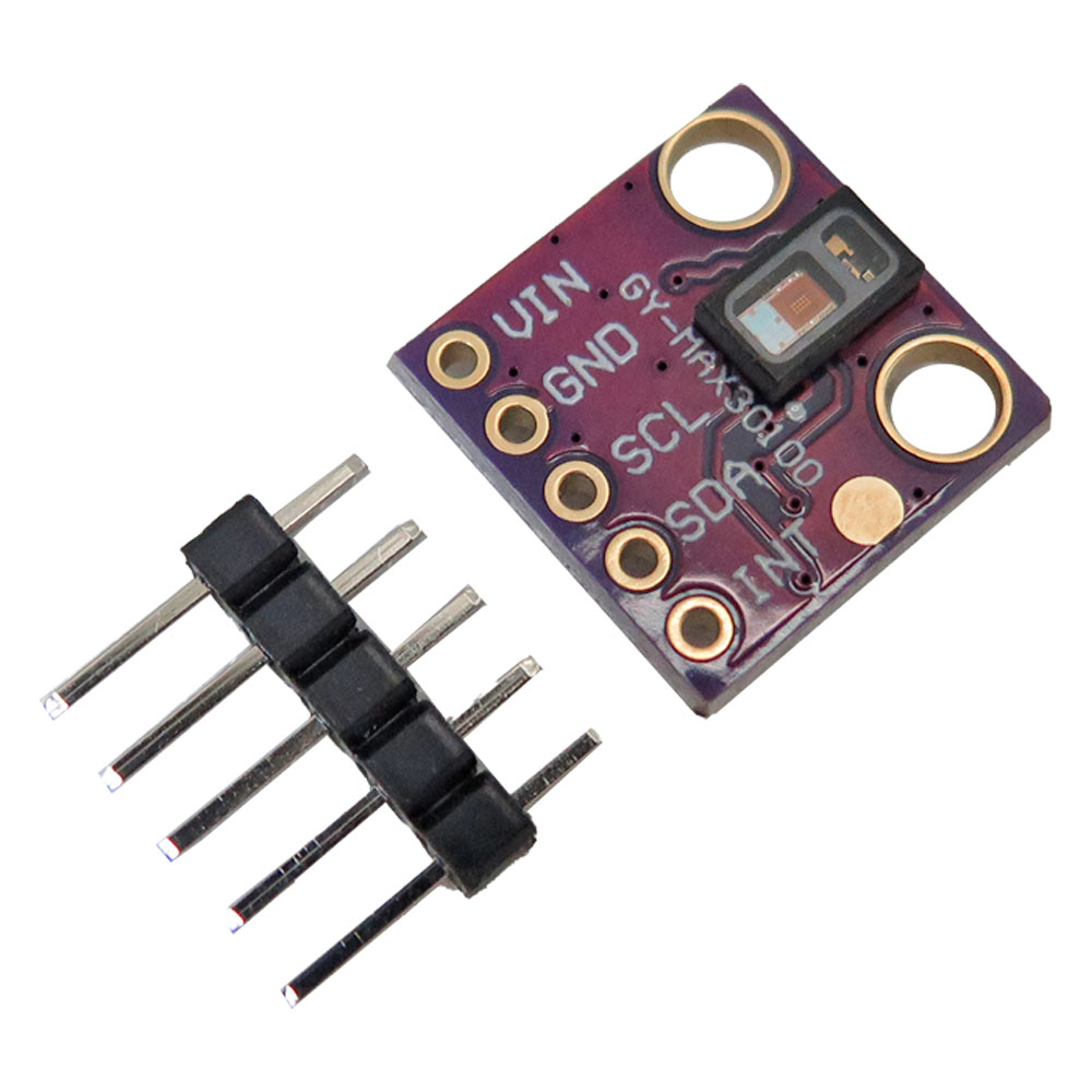 The MAX30102 is an integrated pulse oximetry and heart-rate monitor module. It includes internal LEDs, photodetectors, optical elements, and low-noise electronics with ambient light rejection. The MAX30102 provides a complete system solution to ease the design-in process for mobile and wearable devices. The MAX30102 operates on a single 1.8V power supply and a separate 3.3V power supply for the internal LEDs. Communication is through a standard I2C-compatible interface. The module can be shut down through software with zero standby current, allowing the power rails to remain powered at all times.