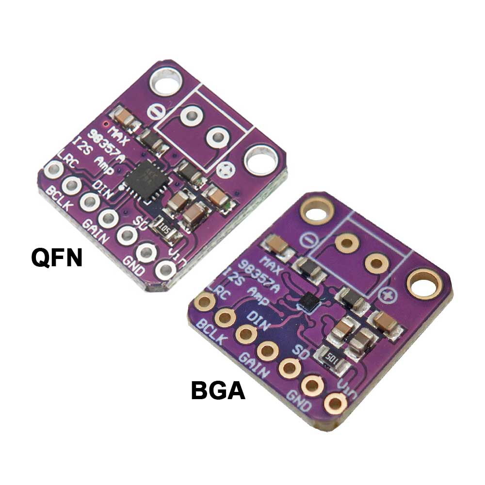 یکی از تفاوت های مهم ماژول های MAX98357 مربوط به نوع بسته بندی تراشه است. این آی سی در دو نسخه QFN/TQFN (مدل معمولی) و BGA عرضه می شود. در مدل BGA، پایه ها به شکل توپ های لحیم در زیر تراشه قرار دارند. این طراحی باعث کوچک تر شدن ابعاد ماژول، بهبود انتقال حرارت و افزایش پایداری الکتریکی می شود. بنابراین نسخه BGA انتخاب مناسبی برای بردهای فشرده و پروژه های حرفه ای مانند ESP32 و Raspberry Pi است. در مقابل، نسخه های معمولی QFN/TQFN به دلیل پایه های قابل مشاهده، برای تعمیر و لحیم کاری دستی گزینه ساده تر و ارزان تری محسوب می شوند.