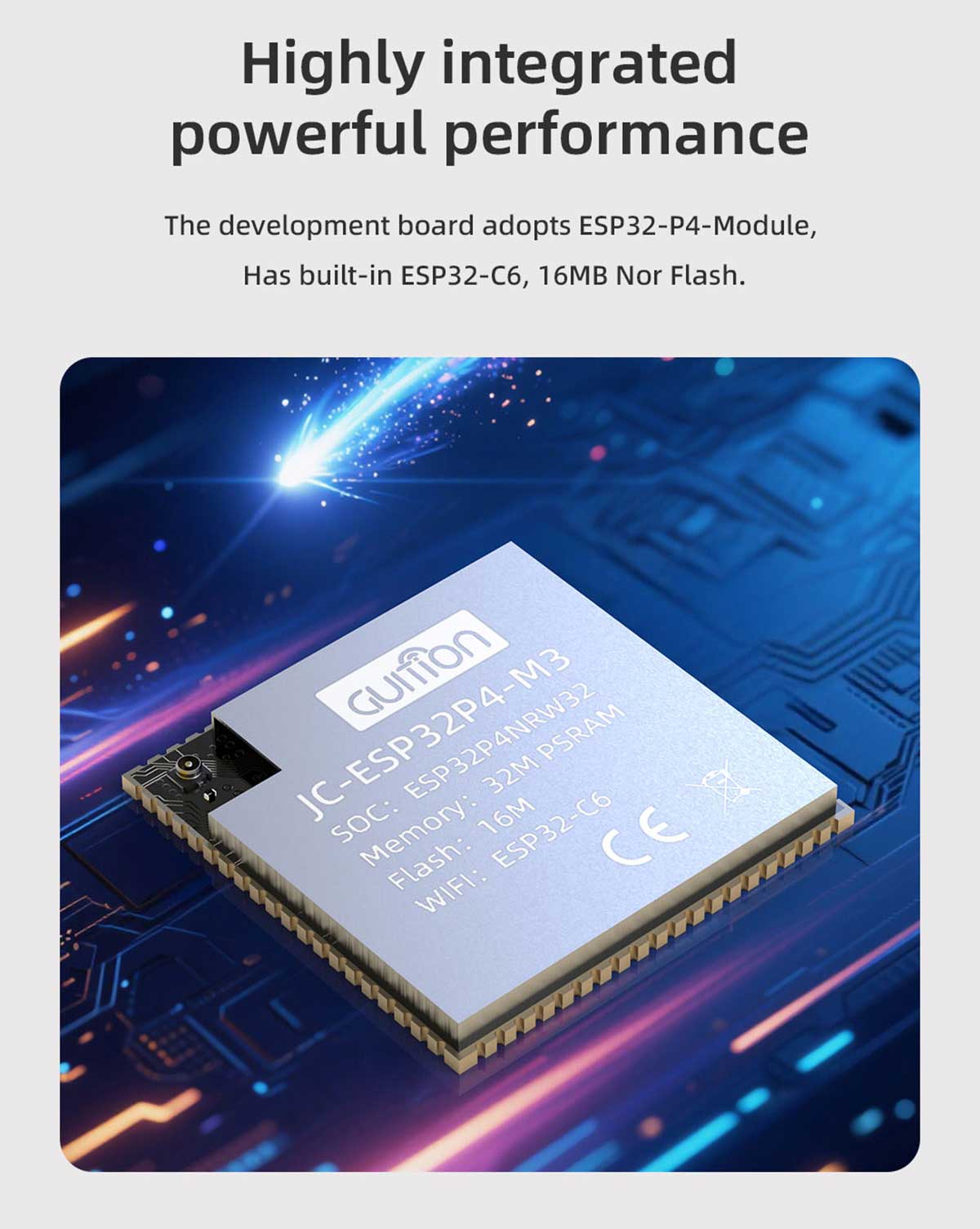 به همین دلیل یک گزینه ی عالی برای پروژه های اینترنت اشیاء (IoT)، پردازش لبه (Edge Computing)، رباتیک، سیستم های تعاملی، هوش مصنوعی، و اتوماسیون صنعتی به شمار می آید. در قلب این ماژول JC-ESP32P4-M3 تراشه ی ESP32 P4 قرار گرفته است که به عنوان پردازنده ی اصلی با معماری RISC-V چند هستهای و فرکانس کاری تا حدود 400 مگاهرتز عمل می کند. این تراشه دارای واحدهای سخت افزاری شتاب دهنده ی هوش مصنوعی و یادگیری ماشین است که اجرای مدل های ML را به صورت محلی (On-Device) ممکن می سازد.