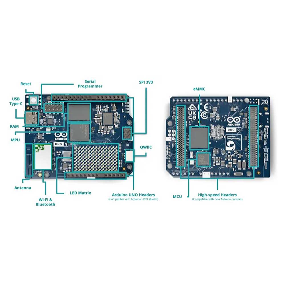UNO Q بردی از آردوینو است که قابلیت اجرای Linux را دارد و شامل پردازنده چهار هستهای Qualcomm Dragonwing™ QRB2210 با GPU و یک میکروکنترلر STM32U585 است. این ترکیب امکان اجرای همزمان برنامههای Linux، کنترل بلادرنگ و هوش مصنوعی سبک را فراهم میکند.