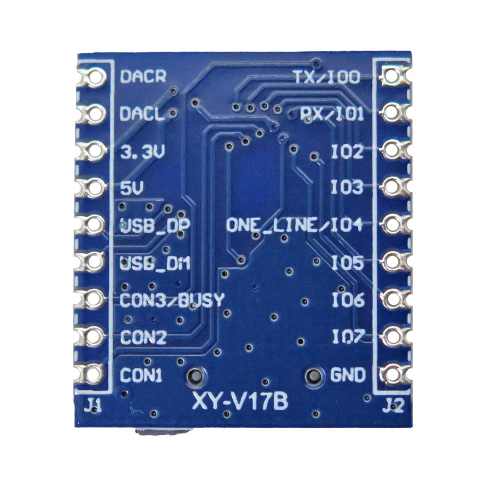 برد XY-V17B با پشتیبانی از کارت حافظه تا 32 گیگابایت، تنظیم سطح صدا تا 31 مرحله، حالت های مختلف پخش و ورودی های تریگر مستقل، برای کاربردهایی مانند سیستم های اعلان صوتی، آسانسور، دستگاه های صنعتی، تجهیزات پزشکی، رباتیک، کیوسک ها و پروژه های IoT بسیار مناسب است. طراحی استاندارد ماژول پخش صوت XY-V17B با ورودی کارت SD ، کانکتورهای متنوع، مصرف انرژی پایین و عملکرد پایدار، این ماژول صوتی را به انتخابی مطمئن برای طراحان سیستم های صوتی فشرده و حرفه ای تبدیل کرده است.